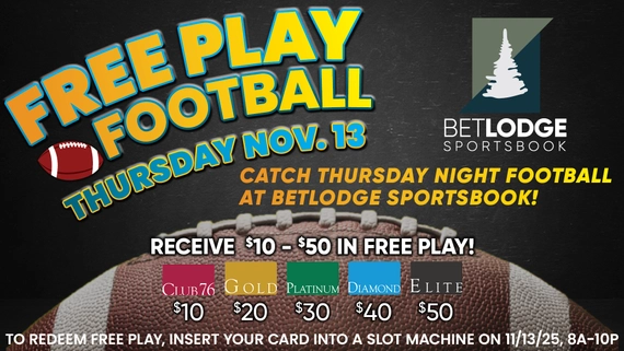 Simply insert your Club 76 Players Card into any slot machine for Free Play on Thursday, November 13th, 2025. Free Play amounts are awarded based on Tier Level. Visit Club 76 for details.