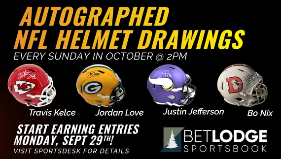 Every Sunday in October, we are giving away an autographed NFL Helmet. Entries are earned with every $100 BetLodge Sportsbook wager. Be sure to visit the BetLodge Sports desk for details.