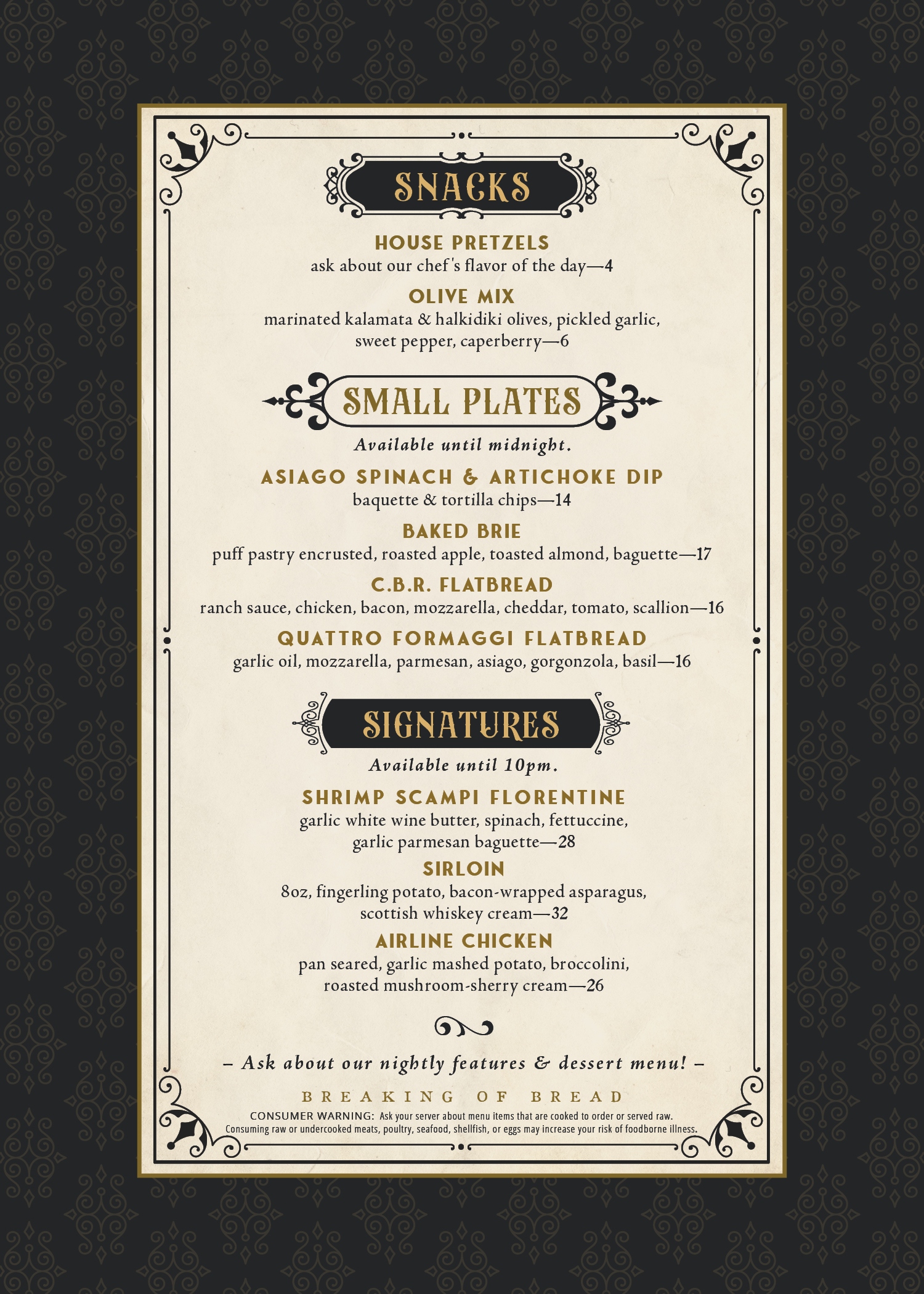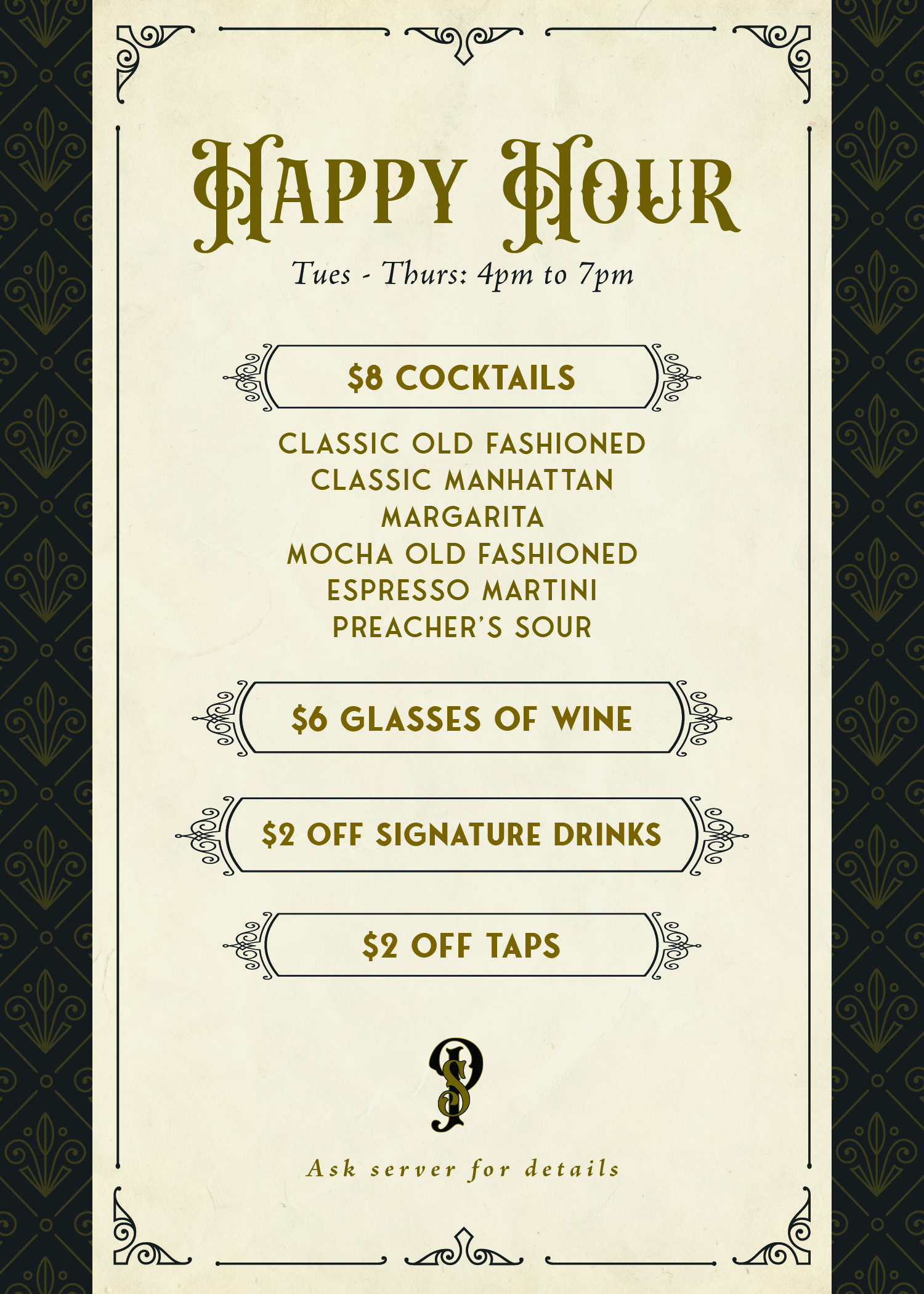 Our Happy Hour specials are available Tuesday – Thursday, 4p to 7p.